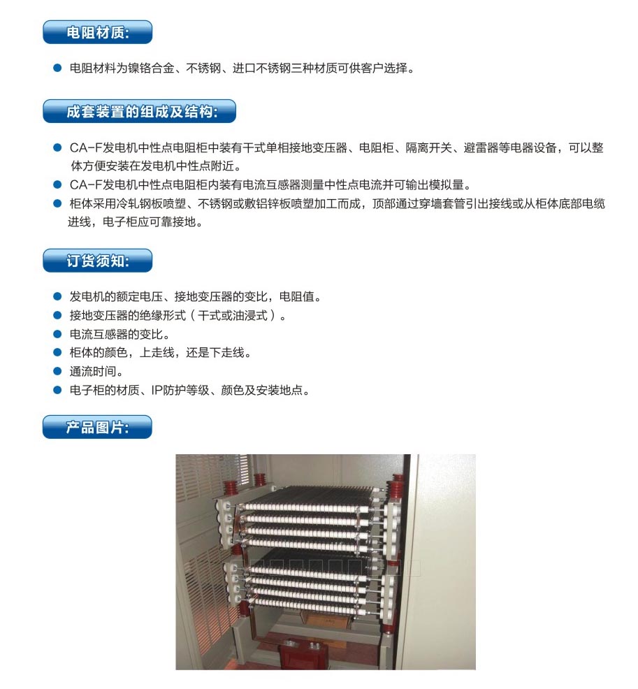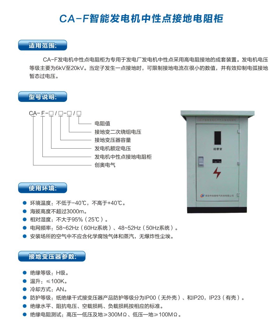 • CA-F發(fā)電機中性點電阻柜為專用于發(fā)電廠發(fā)電機中性點采用高電阻接地的成套裝置。發(fā)電機電壓 等級主要為6kV至20kV。當(dāng)定子發(fā)生一點接地時,可限制接地電流在很小的數(shù)值,并有效抑制電弧接地 暫態(tài)過電壓。...