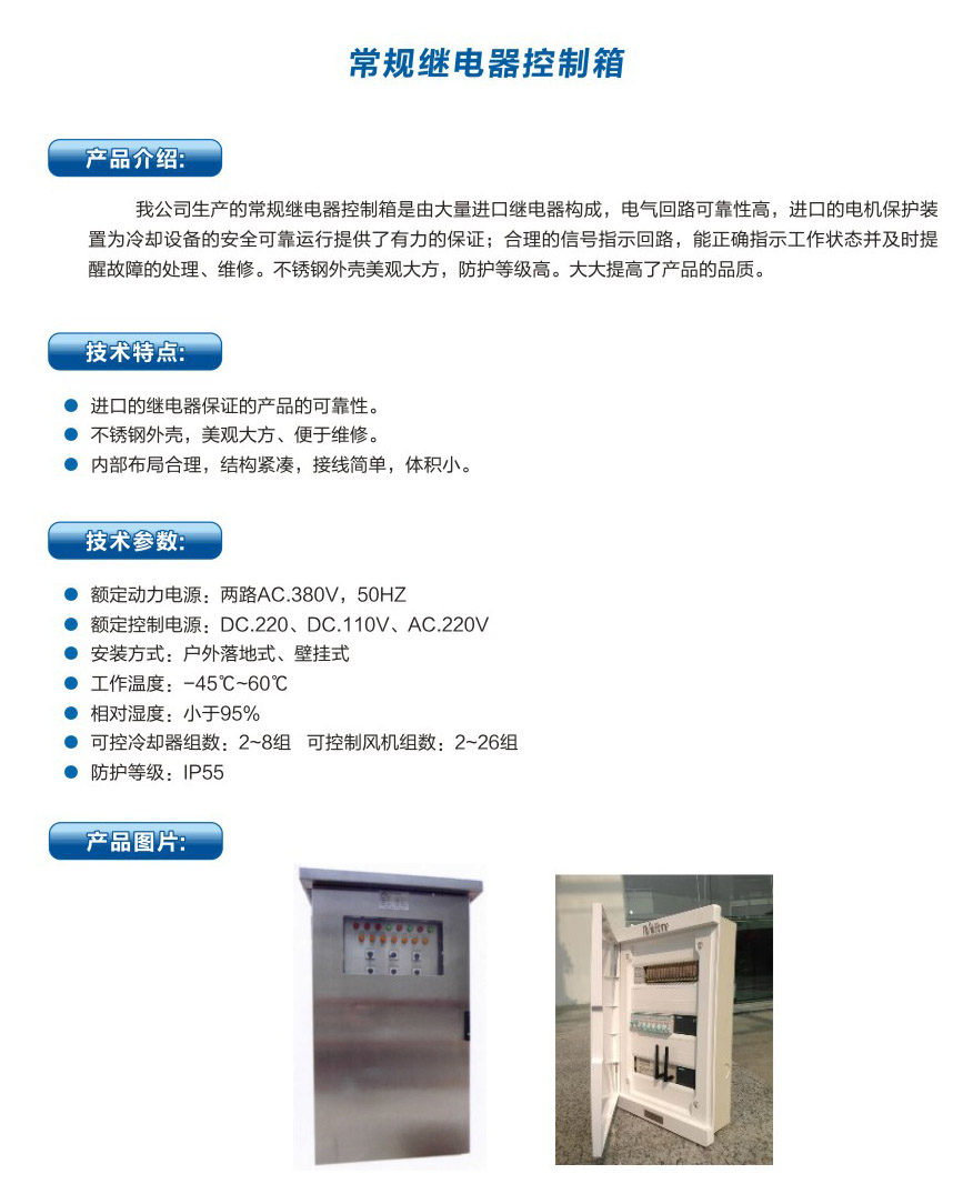 • 我公司生產(chǎn)的常規(guī)繼電器控制箱是由大量進口繼電器構(gòu)成,電氣回路可靠性高,進口的電機保護裝 置為冷卻設(shè)備的安全可靠運行提供了有力的保證;合理的信號指示回路,能正確指示工作狀態(tài)并及時提 醒故障的處理、維修。不銹鋼外殼美觀大方,防護等級高。大大提高了產(chǎn)品的品質(zhì)。...